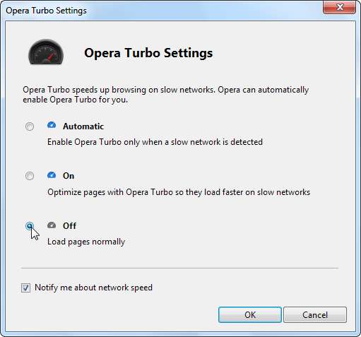 Esto puede ayudar mucho en conexiones más lentas, pero no es necesario en conexiones rápidas. Puede desactivar Opera Turbo para evitar que su actividad de navegación pase por los servidores de Opera.