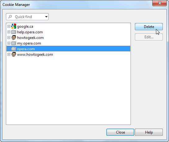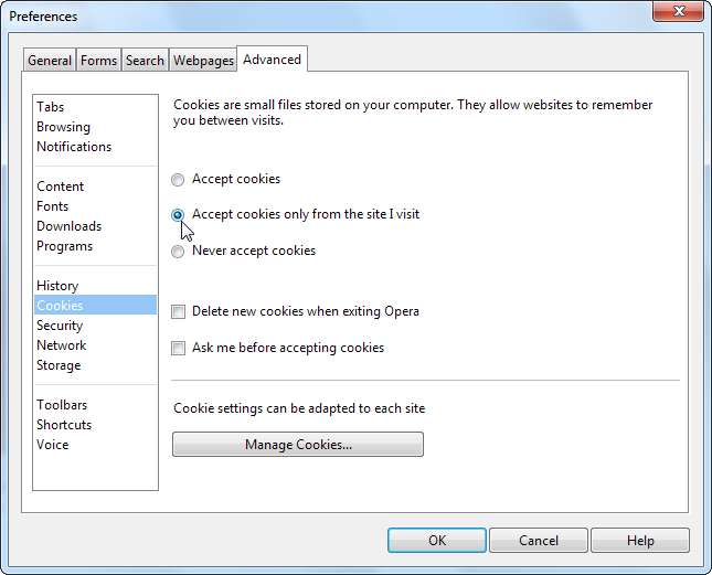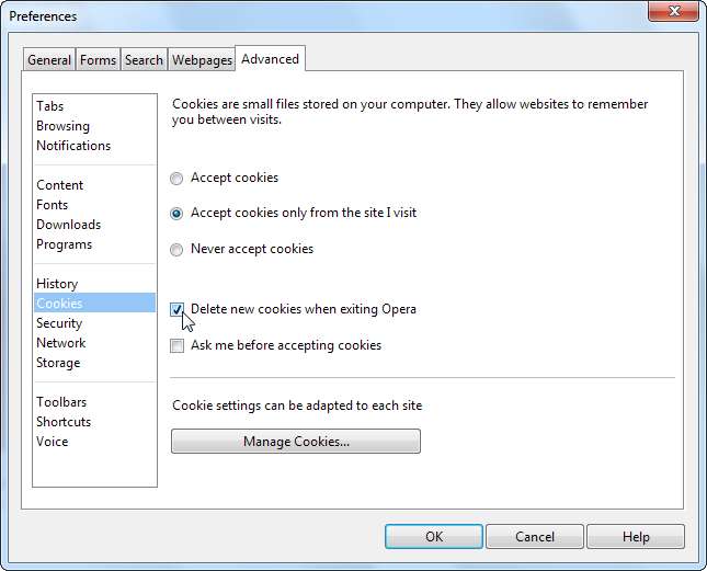 La casilla de verificación "Eliminar cookies nuevas al salir de Opera" le permite mantener las cookies habilitadas para que los sitios web funcionen correctamente, pero las descarta cada vez que sale de Opera para que no puedan rastrearlo. La desventaja es que tendrá que volver a iniciar sesión en cada sitio web que utilice cuando abra Opera, a menos que utilice el cuadro de diálogo Administrar cookies para guardar estas cookies entre sesiones del navegador.
