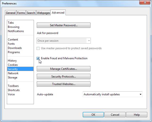 Esta función ayuda a protegerte, pero puedes desactivarla si no te sientes cómodo con Opera transmitiendo esta información. Simplemente desmarque la casilla de verificación "Habilitar protección contra fraude y malware" en el panel Seguridad.