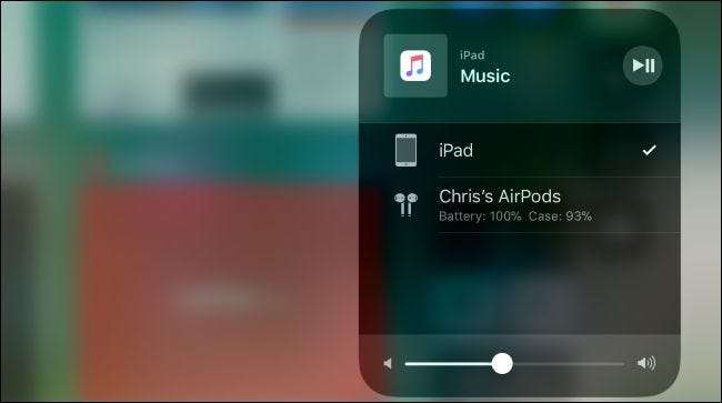 En un iPad, abra el Centro de control, toque el icono de la onda de audio en la esquina superior derecha de los controles de música o mantenga presionados los controles de música y toque el icono del conmutador de dispositivo, y seleccione sus AirPods en el lista de dispositivos de audio .