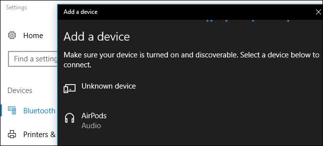 Mientras la luz blanca está parpadeando, tus AirPods serán "detectables". En otras palabras, aparecerán como un periférico que puede emparejar desde la configuración de Bluetooth , como cualquier otro auricular o altavoz Bluetooth. Por ejemplo: