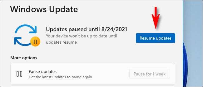 Para volver a encender las actualizaciones automáticas, abrir la configuración de Windows y navegar a "Windows Update" en la barra lateral. Cerca de la parte superior de la ventana, haga clic en el botón "Actualizaciones de reanudación".