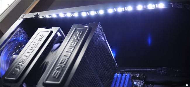 Puede obtener esta luz de algunos lugares diferentes. Los ventiladores LED obviamente proporcionan un poco de luz, pero no una tonelada, la luz está más localizada en el ventilador mismo. La mejor manera de iluminar toda la carcasa es una tira de iluminación LED como Línea BitFenix Alchemy (mostrado anteriormente). Si está dispuesto a gastar un poco más, Tono NZXT es otra opción que ofrece varios colores en una tira, así como la capacidad de atenuar o apagar las luces como mejor le parezca (para cuando simplemente se vuelven demasiado brillantes).