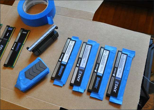 Use cinta de enmascarar para cubrir cualquier cosa que no desee pintar. Si está pintando sus difusores de calor RAM, puede enmascarar los chips reales o quitar los difusores de calor de la RAM por completo. Este último es un poco más seguro, pero requiere más trabajo. Si sigue esa ruta, asegúrese de reemplazar las almohadillas térmicas con almohadillas de igual grosor. (Opté por enmascarar el PCB y funcionó bien).