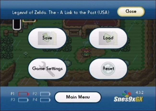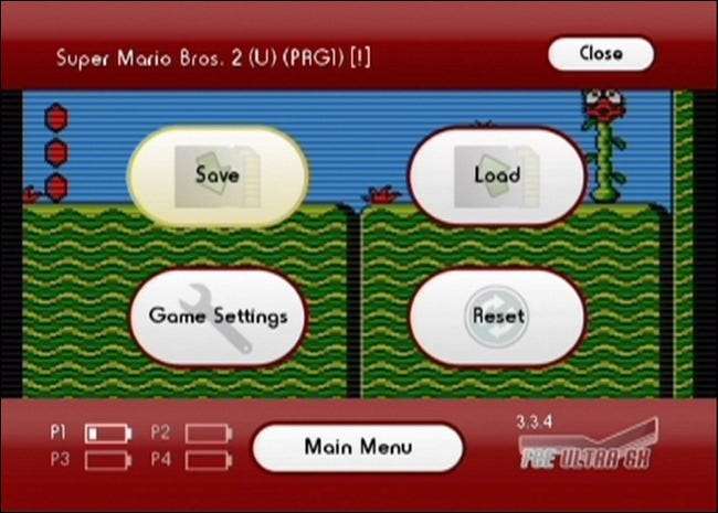 En cualquier momento durante el juego, puedes presionar la tecla Inicio en el Wiimote (o presionar Izquierda en la palanca de control analógica derecha de los controladores de GameCube) para acceder al menú del juego del emulador de la siguiente manera: