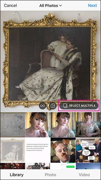 Abra Instagram y haga clic en el signo más para agregar una nueva foto. Seleccione la primera foto que desea agregar y luego toque Seleccionar varios.