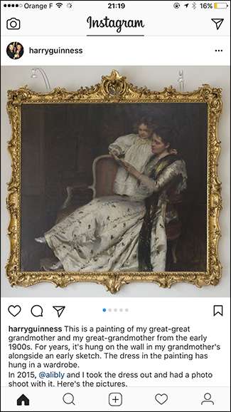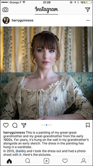 Cuando haya terminado, toque Compartir y todas las imágenes se publicarán en su línea de tiempo. A continuación se muestra cómo se ve una publicación con varias imágenes. Los pequeños puntos en la parte inferior te indican que hay más de una imagen en la publicación. Desliza para ver la siguiente foto.