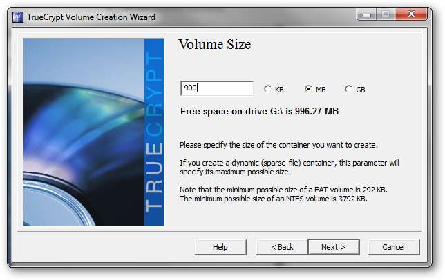 Establezca el tamaño del volumen cifrado. Asegúrese de dejar al menos 10 MB libres para que haya espacio para los archivos TrueCrypt necesarios para montar y desmontar el volumen.