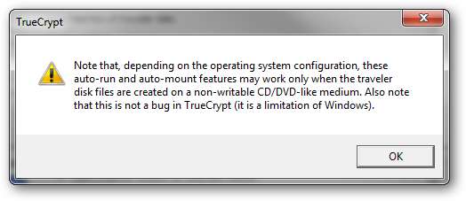 Observe que hay un archivo autorun.inf que se creó durante la instalación. Volviendo al cuadro de mensaje que dijimos que discutiríamos más adelante, esto está destinado a ejecutarse automáticamente cuando la unidad flash está conectada a la máquina host, sin embargo, la mayoría de las máquinas con Windows tienen la opción AutoRun desactivada (como debería), por lo que esto nunca se ejecutará . Debido a esto, tendrá que montar y desmontar su volumen TrueCrypt manualmente.