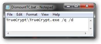 Cree un nuevo archivo de texto llamado DismountTC.bat y pegue lo que copió anteriormente en este archivo. Cuando se ejecuta, este archivo por lotes desmontará todos los volúmenes de TrueCrypt en el sistema host.
