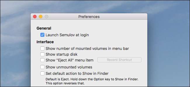 Entrar Semulov . Esta aplicación liviana de código abierto agrega un botón "Expulsar" a la barra de menú de su Mac, para que pueda desmontar cualquier unidad con solo dos clics. Incluso puede crear un método abreviado de teclado universal para desmontar cada unidad conectada a su computadora, evitando tener que abrir el Finder y desmontar todo individualmente.
