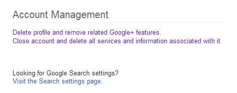 Google también le permite eliminar por completo su cuenta; simplemente haga clic en el enlace "Cerrar cuenta y eliminar todos los servicios y la información asociada" en la sección Administración de cuentas de su cuenta.