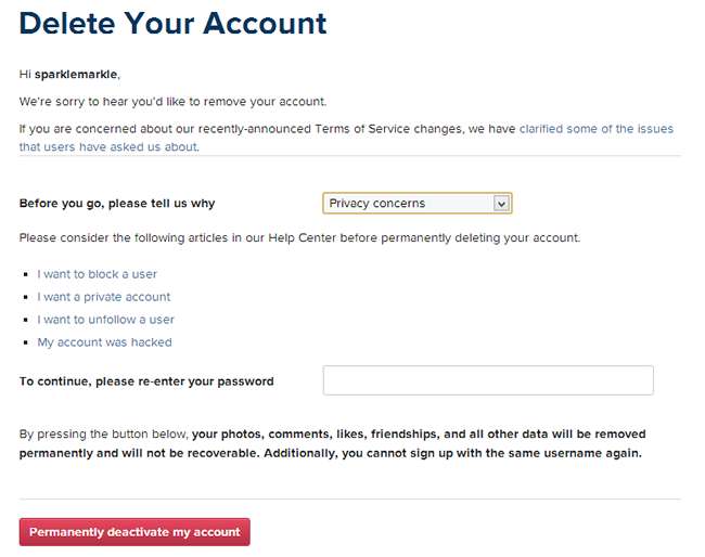 Seguir esta ruta básicamente pone sus cuentas en espera y le permite reactivarlas en caso de que cambie de opinión más adelante. Para iniciar el proceso, pague un visita a la página de desactivación .