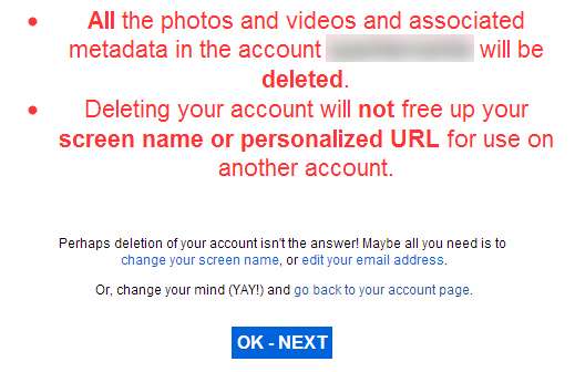 Cerca de la parte inferior de la página, haga clic en el enlace "Eliminar su cuenta de Flickr" y confirme que está feliz de continuar haciendo clic en Aceptar - Siguiente.
