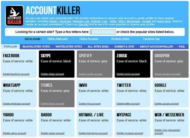 Es posible que también desee echar un vistazo a AccountKiller que proporciona detalles sobre cómo eliminar todo tipo de cuentas en línea. Los servicios están organizados en una lista blanca (aquellos que proporcionan un proceso simple de eliminación de la cuenta), una lista gris (aquellos que son un poco problemáticos) y una lista negra (aquellos servicios que no permiten la eliminación de la cuenta o lo hacen complicado).