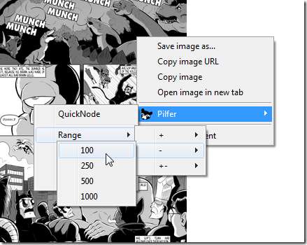 Con Pilfer instalado (¡es posible que tenga que reiniciar su navegador!), Haga clic con el botón derecho en la imagen, elija Pilfer y elija un rango de números que deberían capturar todas las imágenes que necesita. En este caso, solo buscamos los episodios 1 a 100, por lo que elegimos 100.