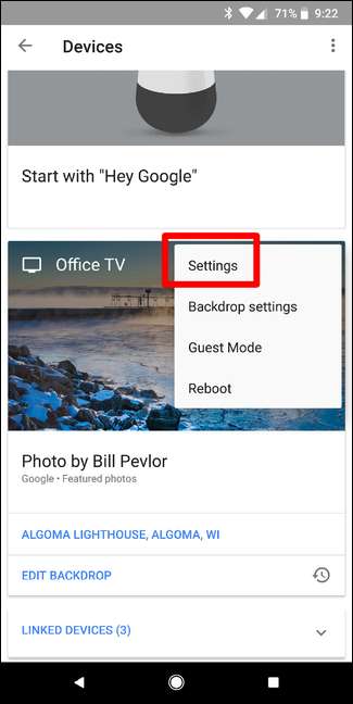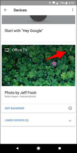 Una vez que su televisor esté encendido, inicie la aplicación Google Home en su teléfono o tableta y toque el botón "Dispositivos" en la esquina superior derecha. Si tiene varios dispositivos Google Cast, simplemente desplácese hasta encontrar el Chromecast que desea reiniciar o restablecer. Toca el menú de desbordamiento de tres puntos en la esquina superior derecha de la tarjeta Chromecast; debería mostrar la misma imagen que está actualmente en tu televisor, conocida como "fondo".
