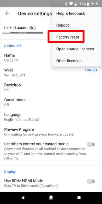 Para restablecer el Chromecast de fábrica, toque el botón "Configuración". Luego, toca el menú de tres puntos en la esquina superior derecha y elige "Restablecimiento de fábrica".