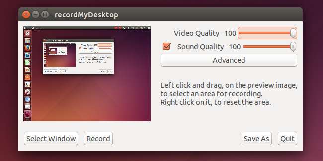 Inicie recordMyDesktop y use sus opciones para elegir niveles de calidad de video y audio. Esta herramienta puede grabar todo su escritorio o solo una pequeña parte. recordMyDesktop funciona bien, proporciona una interfaz simple y ofrece las opciones de grabación de escritorio más importantes.