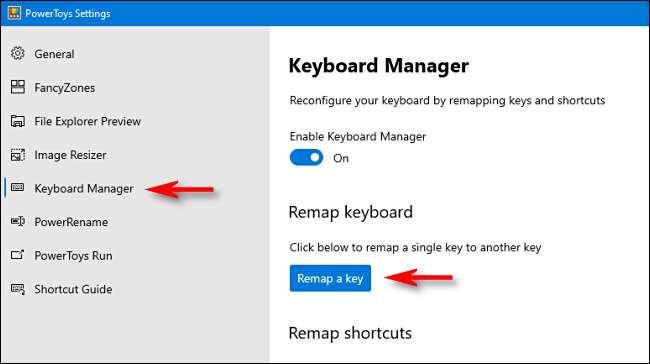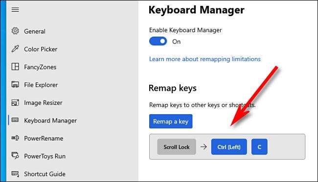 Si aún no tienes Powertoys instalado, Descárgalo gratis de GitHub. Después de instalarlo, inicie la configuración de PowerToys, luego haga clic en "Administrador de teclado" en la barra lateral. En la configuración del "Administrador del teclado", haga clic en "Revolver una tecla".