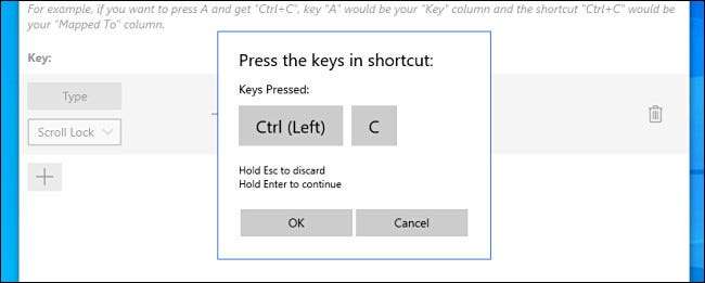 Si desea utilizar una combinación de teclas de acceso directo, presione el botón "TIPO", luego presione la combinación en su teclado. Por ejemplo, aquí hemos escrito "Ctrl + C" para el acceso directo de "Copiar" de Windows estándar.