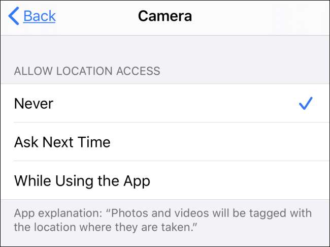 Si se encuentra deshabilitando con frecuencia los datos de ubicación antes de compartir fotos, es posible que desee considerar apagarlo en la aplicación Cámara . De esta manera, ninguna de sus nuevas fotos incluirá datos de ubicación.