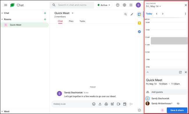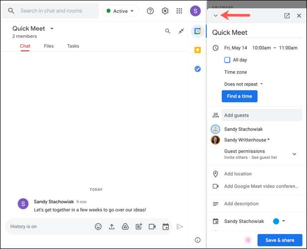 Vas a ver el evento aparece en el historial de chat para que la conversación en el chat de Google. A continuación, puede hacer clic en la “X” en la esquina superior derecha de la barra lateral de Google Calendar para cerrarla.