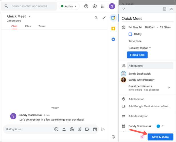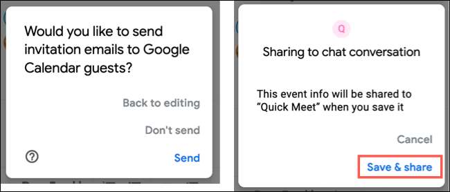 Se le preguntará si desea enviar por correo electrónico invitaciones a eventos a los participantes. Esto es opcional, así que seleccione la opción que desea. También verá una nota diciendo que el evento se añadirá a esa conversación en el chat de Google. Haga clic en "Guardar y amplificador; Compartir”para confirmar.