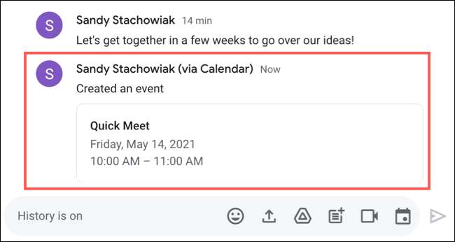 A continuación, se dirigirá de nuevo a chat de Google y ver el evento en el historial de conversaciones. Y al igual que en línea, puede pulsar el caso en el chat para editar sus detalles si es necesario.