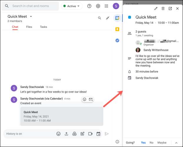 Si desea realizar cambios en el evento, haga clic en el historial de conversaciones de chat. Esto volverá a abrir la barra lateral Google Calendar. A partir de ahí, se puede editar, eliminar o responder al evento.