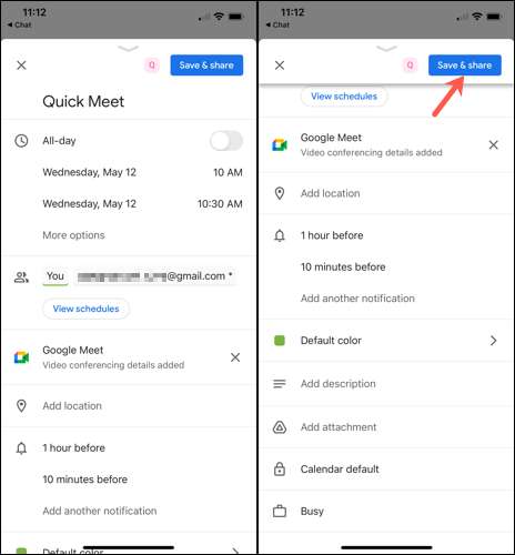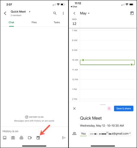 A continuación, pulse el botón evento de programación de calendario (que se parece a un icono de calendario) en la parte inferior del cuadro de mensaje. Verá brevemente el chat de Google cambiar a la pantalla de detalles del evento en Google Calendar ( Androide / iPhone / iPad ).