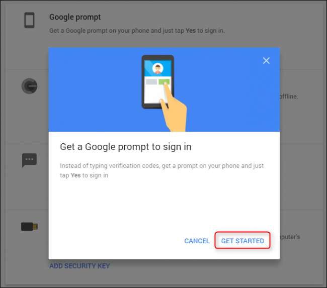 Hay una variedad de opciones aquí, pero la que está buscando es "Mensaje de Google". Haga clic en el botón "Agregar teléfono" para comenzar. Aparecerá una ventana emergente que le brindará detalles de esta opción: "En lugar de escribir códigos de verificación, obtenga un mensaje en su teléfono y simplemente toque si para iniciar sesión ". Suena bastante fácil: haga clic en "Comenzar".