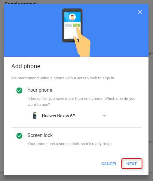En la siguiente pantalla, elegirás tu teléfono de una lista desplegable. Vale la pena señalar que esto requiere un teléfono con una pantalla de bloqueo segura antes de que funcione, por lo que si aún no usa una, ahora es el momento de habilitarla. Si es un usuario de iOS, necesitará el Aplicación de Google de la App Store .