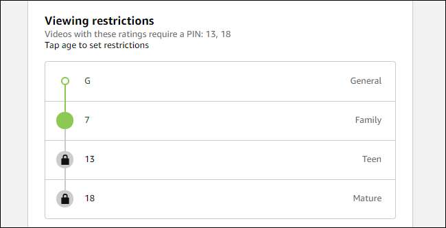 Estas restricciones se basan en las clasificaciones de edad asociadas con los videos en Amazon Prime Video. No hay forma de bloquear o permitir videos individuales dentro de estos grupos de edad.