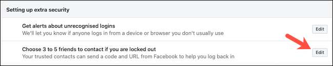 Desplácese hasta la sección "Configuración de seguridad adicional" y seleccione el botón "Editar" junto a "Elija 3 a 5 amigos para contactar si está bloqueado".