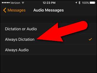 En la pantalla "Mensajes de audio", toque "Siempre dictado" para enviar siempre sus mensajes de texto como texto o "Siempre audio" para enviarlos siempre como audio. Como mencioné, siempre envío mis mensajes como texto, por lo que presiono "Siempre dictado".
