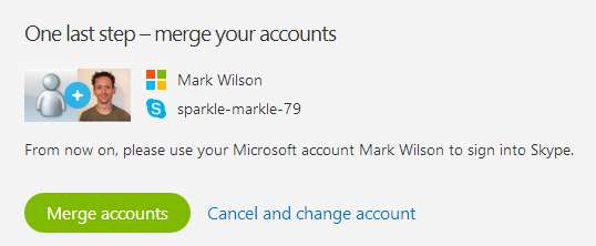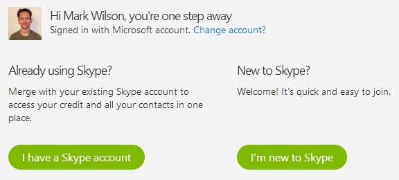 Inicie sesión en su cuenta de Microsoft. Y si ya tiene una cuenta de Skype asociada con otra dirección de correo electrónico, puede optar por fusionar las dos; simplemente haga clic en el botón "Tengo una cuenta de Skype" o "Soy nuevo en Skype".