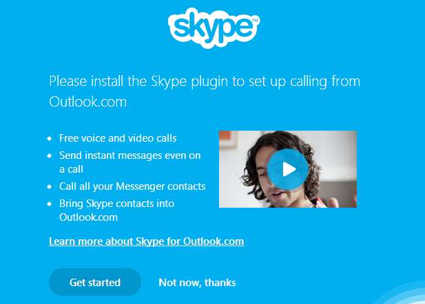 Como mencionamos, Skyping a través de Outlook se habilita mediante el uso de un complemento, y se le invitará a instalarlo ahora, simplemente haga clic en el botón "Comenzar".