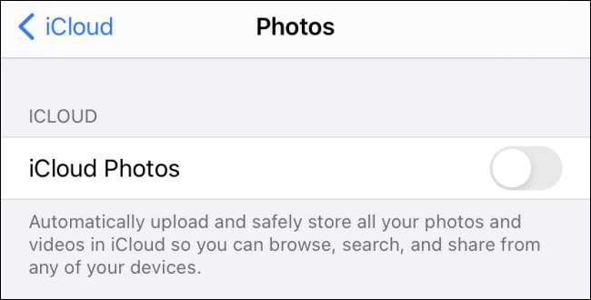 Si está utilizando fotos de iCloud en su iPhone o iPad, el interruptor de fotos de Icloud será verde. Toque la opción "Fotos de Icloud" aquí para Deshabilitar las fotos de Icloud . Se convertirá en gris cuando esté deshabilitado. [dieciséis]