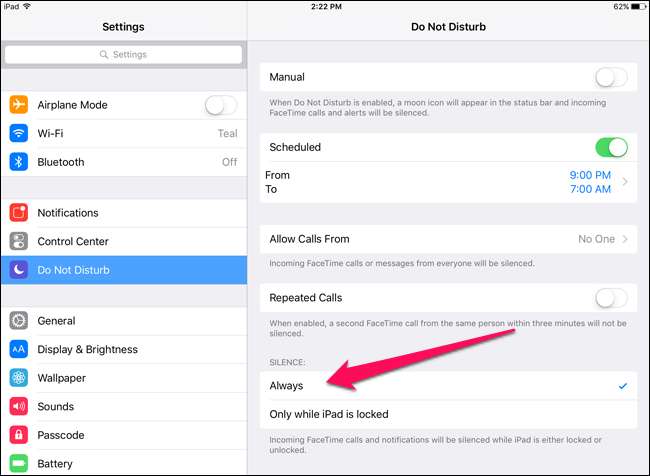 Sin embargo, tendrá que hacer un pequeño ajuste para que esto funcione correctamente. Abra la aplicación Configuración de su iPhone o iPad y diríjase a la sección No molestar. Cambie la configuración de "Silencio" a "Siempre" - no a "Solo mientras el iPad está bloqueado". Esto asegura que su dispositivo silenciará las notificaciones incluso cuando lo esté usando activamente, lo cual es crucial cuando juega.