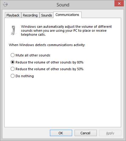 De forma predeterminada, Windows ajusta automáticamente el volumen de otros sonidos en un 80% (su suposición de que los sonidos eran del 10-20%, su volumen anterior era bastante bueno). Puede seleccionar que los sonidos solo se reduzcan en un 50%, que estén completamente silenciados o que Windows no haga nada en absoluto.