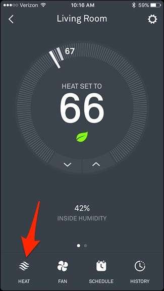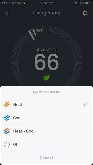 Desde allí, desplácese y seleccione "Calor", "Frío", "Calor-Frío" o "Apagado", tal como lo haría en la aplicación Nest.