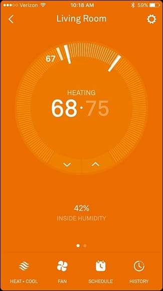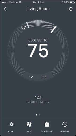 Cambiar de Heat a Cool y viceversa utiliza el mismo método en la aplicación, pero obviamente es un poco diferente en la pantalla más pequeña del termostato Nest.