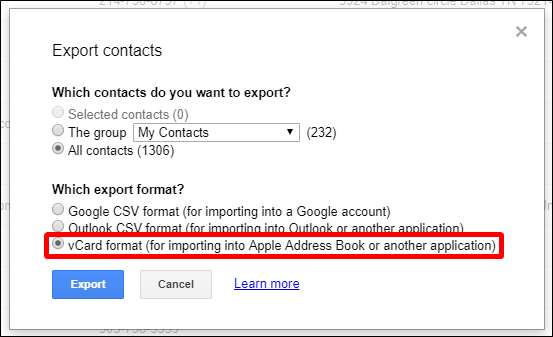 En la pantalla Exportar, elija vCard, luego haga clic en el botón Exportar. Guarda el archivo.
