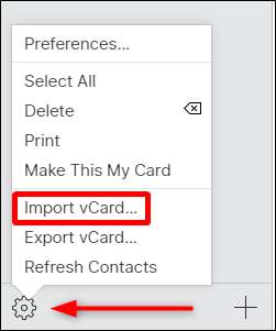 Haga clic en el pequeño icono de engranaje en la esquina inferior izquierda, luego seleccione Importar vCard. Elija la vCard que acaba de descargar de Google.