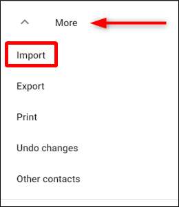 Haga clic en el botón Más y luego en Importar. Nota: La versión anterior de Contactos de Google se ve diferente, pero la funcionalidad sigue siendo la misma.