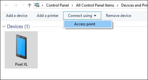Cuando se abre este menú, su teléfono debería estar presente. Haz clic en él y luego en el menú desplegable "Conectar usando". Elija "Punto de acceso".