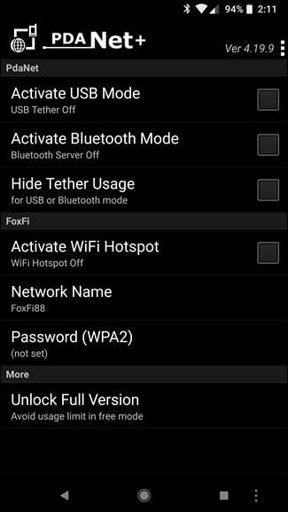 PdaNet + ofrece conexión por Bluetooth y USB en todos los teléfonos Android, mientras que su conexión por Wi-Fi solo funcionará en algunos teléfonos. La versión gratuita se apagará automáticamente y te obligará a volver a encenderla de vez en cuando; puedes hacer que deje de molestarte pagando por la versión completa. A diferencia de muchas otras aplicaciones similares, PdaNet no requiere acceso de root. La función de conexión Wi-Fi incluida es nueva en PdaNet + y es la misma que la popular FoxFi aplicación.