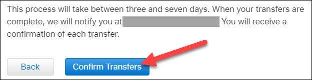 Por último, Apple explica que el proceso llevará entre tres y siete días. Cuando se complete la transferencia, se le notificará a través de su correo electrónico de ID de Apple. Haga clic en "Confirmar transferencias" para terminar.