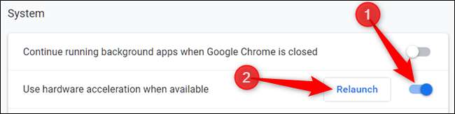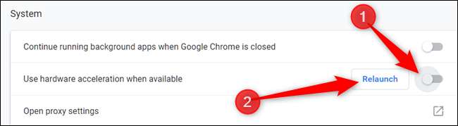 Desplácese hacia abajo hasta la sección Sistema y busque la configuración "Usar aceleración de hardware cuando esté disponible". Mueva el interruptor a la posición "Off" y luego haga clic en "Relanzar" para aplicar los cambios.